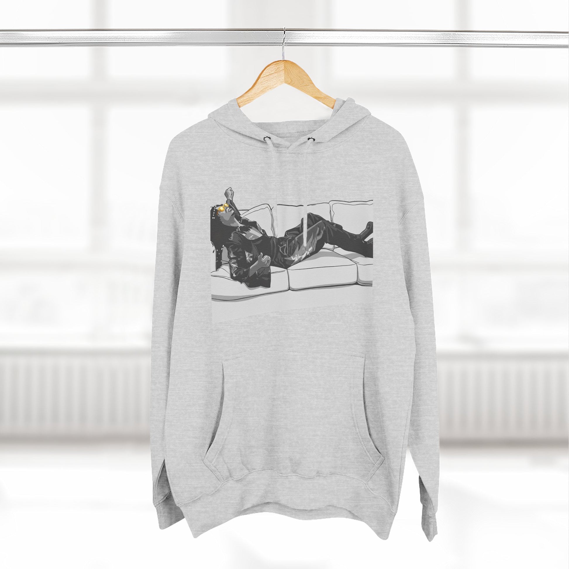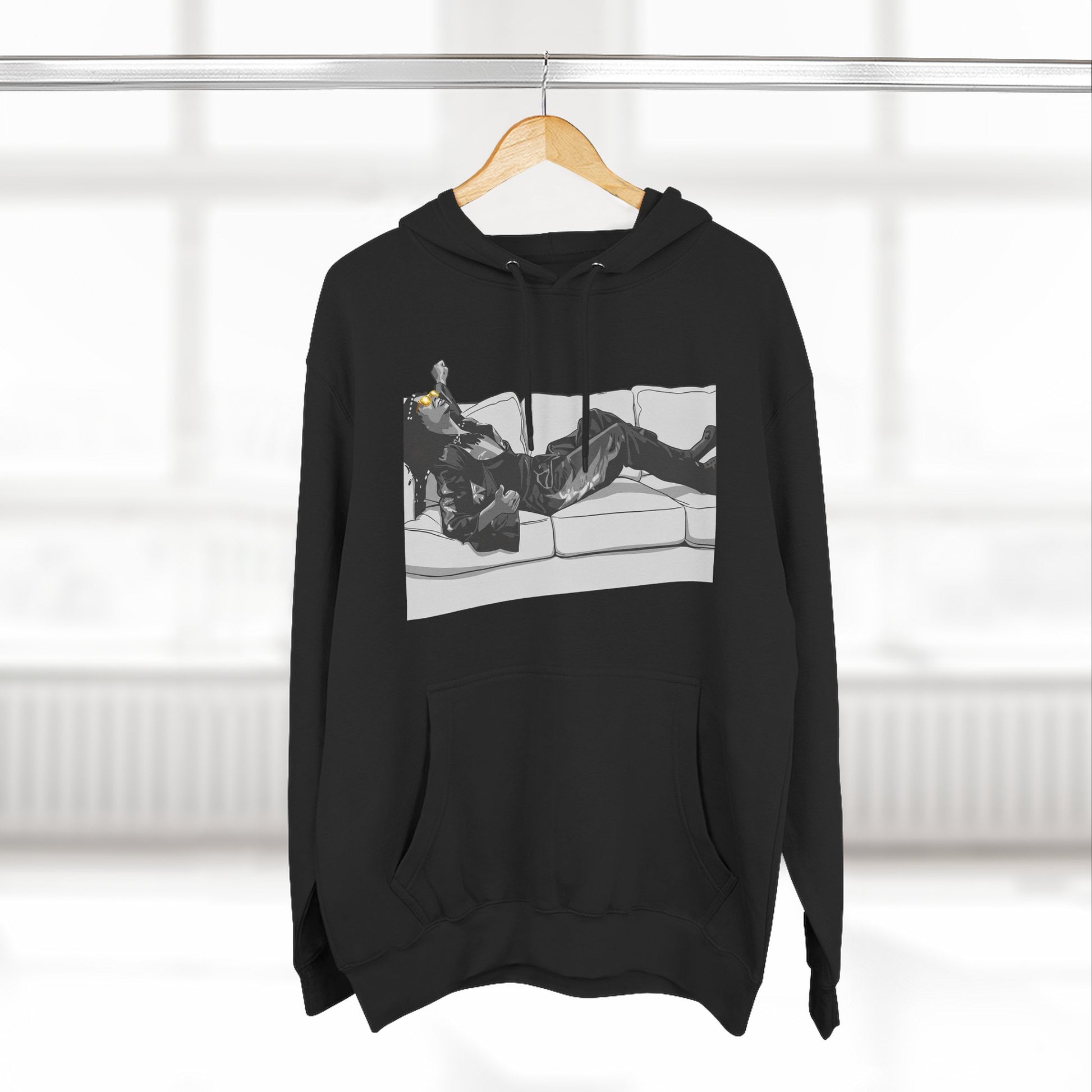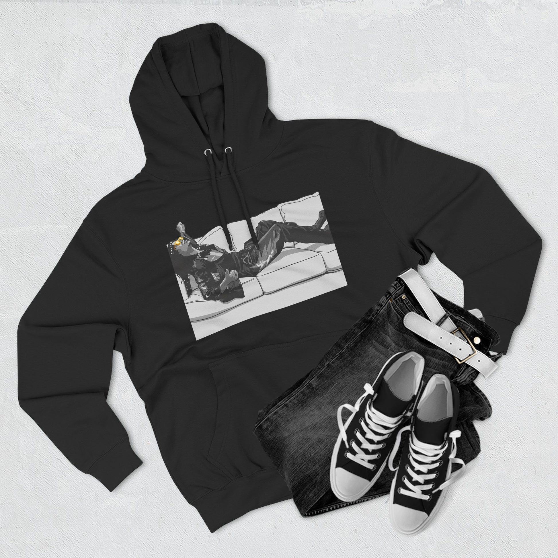A three-panel fleece hoodie featuring a design of Dave Chappelle playing Rick James, exuding a fun and edgy vibe. Perfect for fans of Chappelle's Show and anyone who enjoys unique and bold apparel. Ideal for casual wear, lounging at home, or attending comedy shows and events.