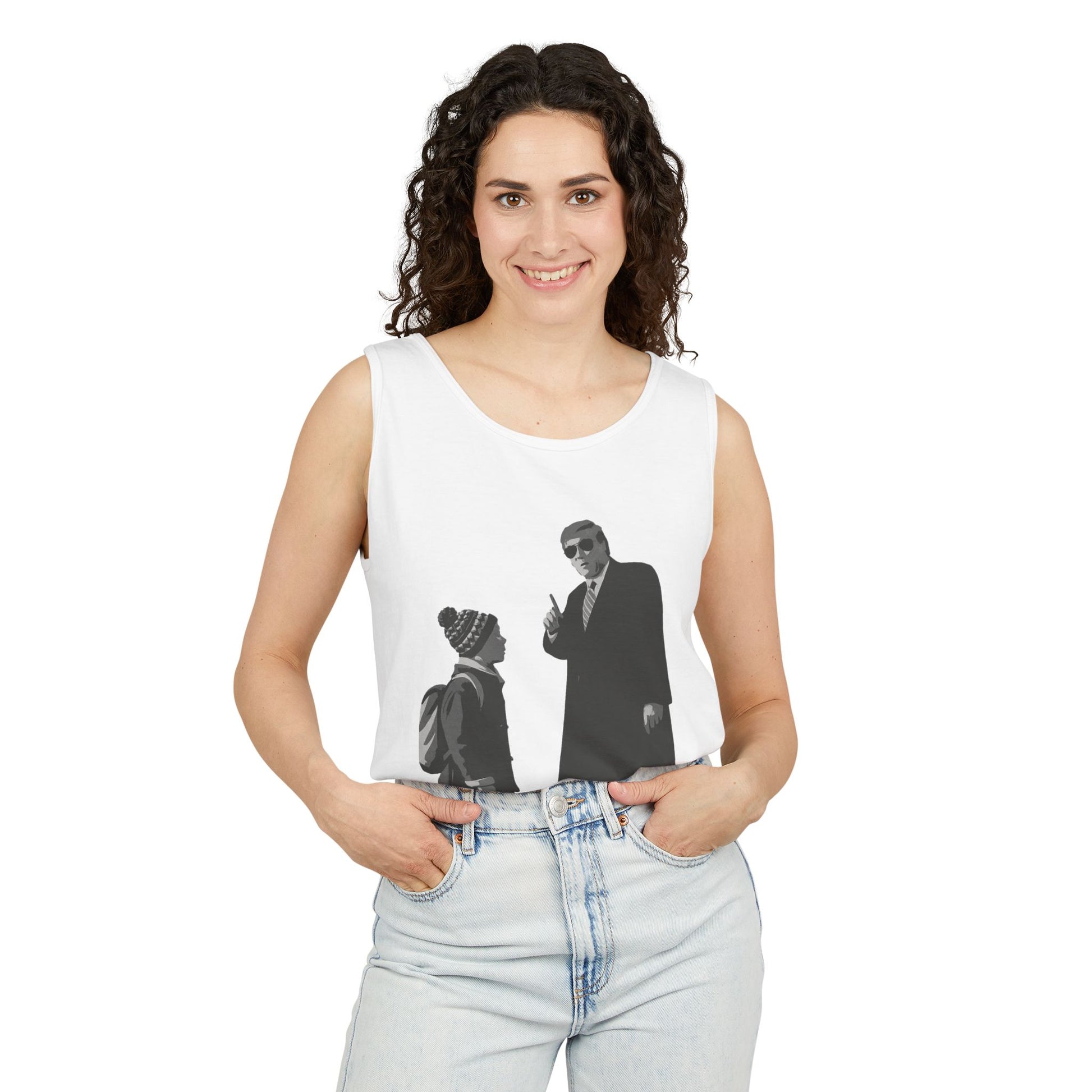 A funny and festive tank top featuring a design of Trump pointing Kevin to the hotel lobby in Home Alone 2. Perfect for fans of the iconic movie looking to add some humor to their wardrobe. Ideal for wearing during Christmas and holiday season gatherings.